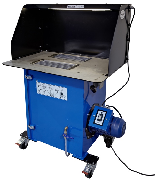 - Arbeitstisch mit Seitenwänden und 6mm starker Stahl-Arbeitsplatte (900x600mm), mit herausnehmbaren Gitterrosten und einer Saugleistung von 2.000m³/h.
